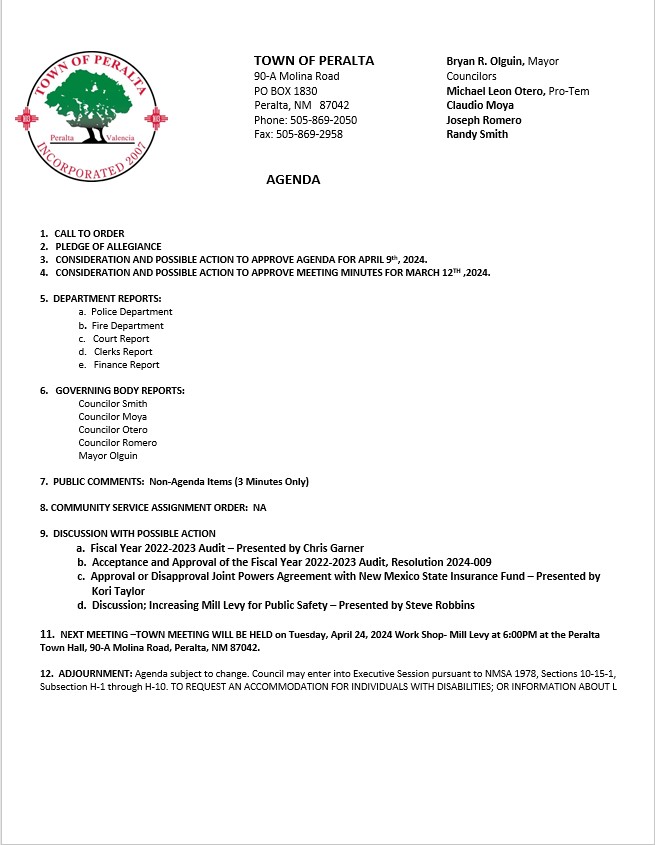 Council Meeting Agenda for Tuesday 4/9/24